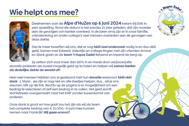 Des te meer beseffen wij ons, dat er nog héél veel onderzoek nodig is en dus véél geld. Samen met Edward, Valentijn en collega Rogier met zijn vrienden Arnout en Sjack gaan ze als team ’t Hupse Zadel fietsend en lopend de berg op.Ze zetten zich voor meer dan 110% in en mede door uw/jouw/jullie donatie proberen we zoveel mogelijk geld op te halen en helpen wij samen kanker als dodelijke ziekte de wereld uit!