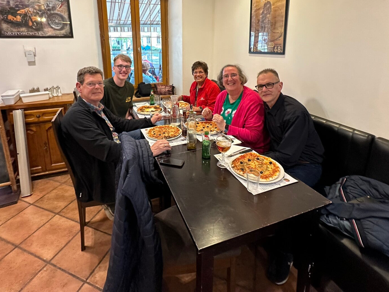 Een Chinees echtpaar runde de keuken en ratelde in het Frans van alles tegen elkaar, maar uiteindelijk kwamen de bestelde pizza’s. Vers gebakken in de houtoven en ze waren heerlijk. Driemaal de pizza Marina, een pizza met tonijn, Carla had een pizza Hawaï (zonder ham) en Valentijn een Américaine met mozzarella, gehakt, tomatensaus en een ei. Uiteindelijk viel het wachten best wel mee.