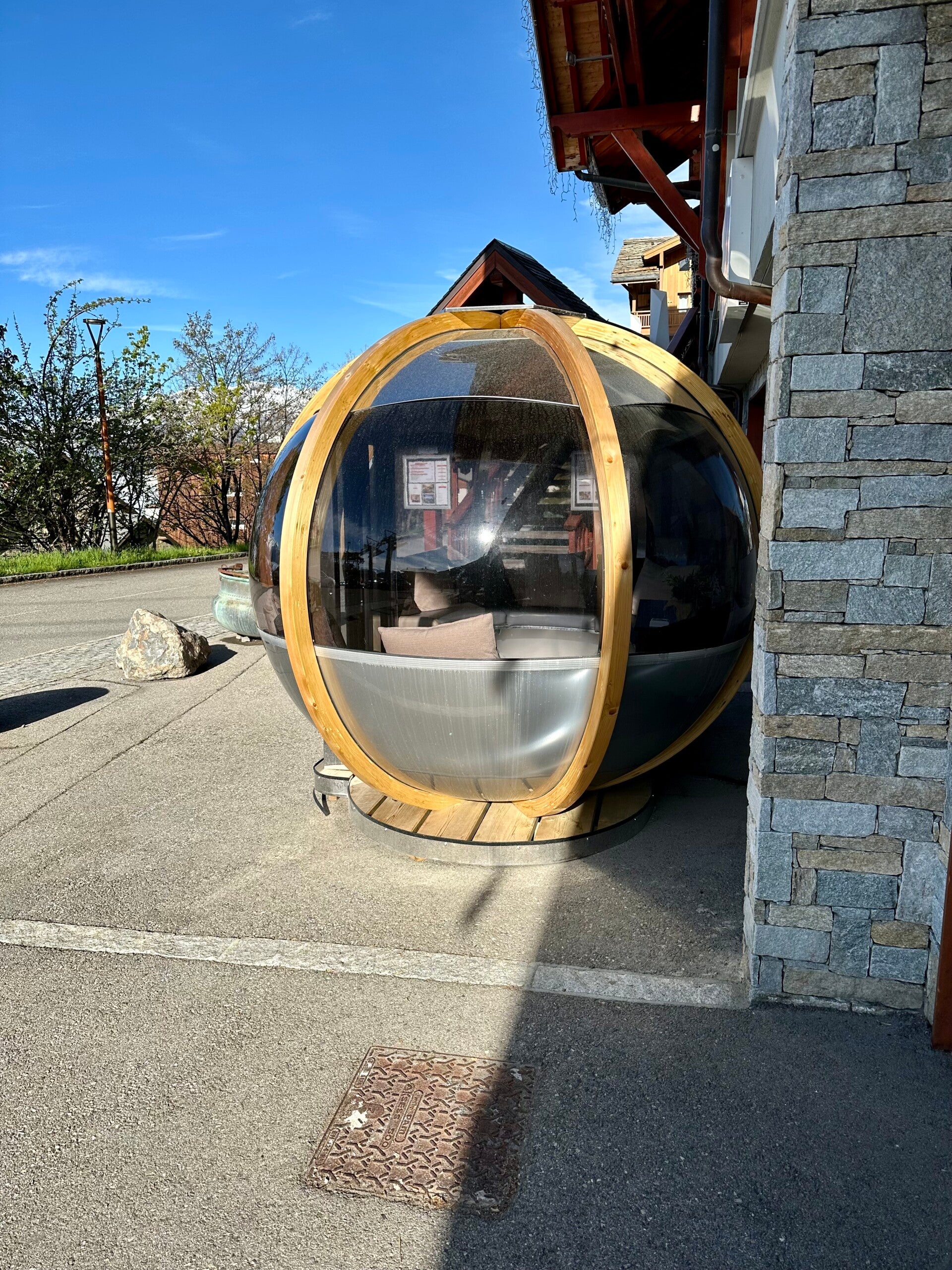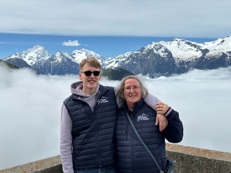 Tijdens het wandelen zagen we al prachtige witte sneeuwtoppen en de wolken hingen ervoor. We kwamen twee wandelaars tegen, die de Alpe d’HuZes gaan lopen en wezen ons een route waar we bijna letterlijk in de wolken zouden staan. Dat moesten we zien, dus hup naar boven. Onderweg kwamen we nog een grote speeltuin tegen, dus onze “kleine” jongen kon zich even uitleven en ook moeders stapte op de crosstrainer, dan hadden we dat ook meteen maar gehad.