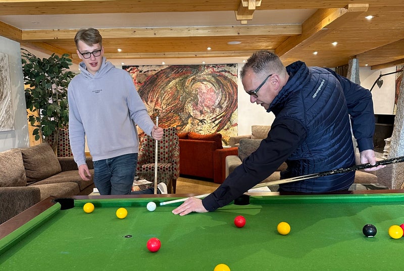 Edward was inmiddels ook terug van het fietsen en opgefrist. Zij moesten nog wat dingen regelen bij de receptie en in de tussentijd speelden Erik, Valentijn en ik een potje biljart. Daarna gingen we met z’n allen met de auto naar beneden om ergens in Le Bourg D’Oisans te gaan eten. We vonden een plekje voor de auto en toen op zoek naar een eettentje. Dat viel nog niet mee, want bovenop de berg zijn bijna geen restaurants open, dus heel Nederland ging naar beneden om wat eten. Uiteindelijk belandden we in een Italiaanse pizzaria, genaamd Rive Gauche (vertaling: linkeroever), waar een zeer gestreste dame ons ontving. Ze wist ons in rap Frans meteen te melden dat het kon, maar wel lang ging duren. Geen probleem, we hebben de tijd, dus mochten we plaatsnemen.