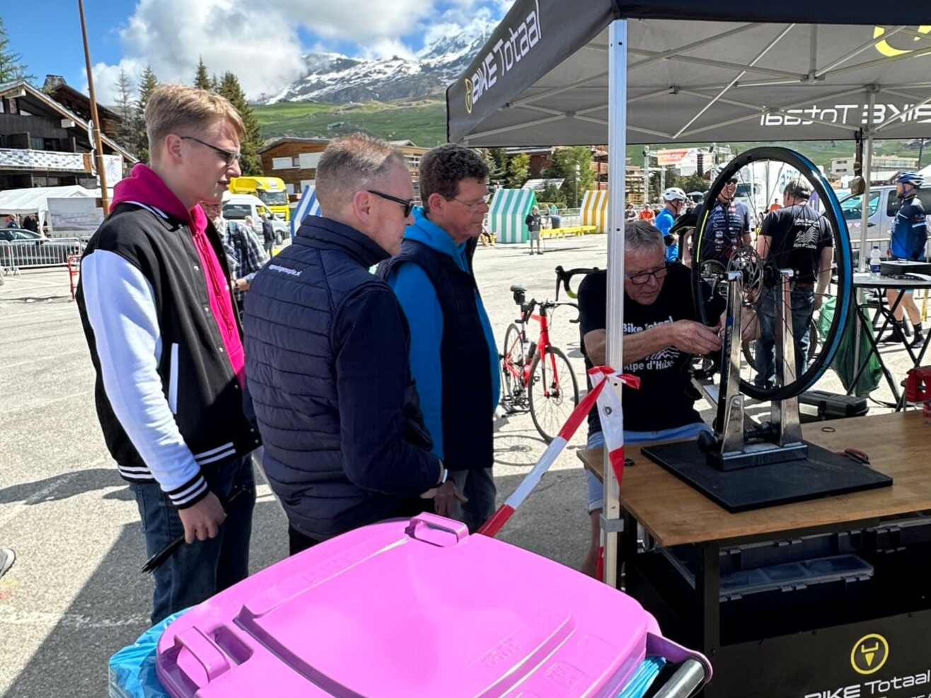 Erik had zijn fiets meegenomen, want hij wilde deze nog even door de vakmensen van Bike Totaal laten nakijken. Hij had het idee dat er een bobbel in zijn voorband zat. Hans van Bike Totaal was zo aardig om de hele fiets even te checken. Hij ontdekte dat de spaken van zijn voorband niet goed zaten. Er was duidelijk al aan de voorband geknoeid door Mantel, voordat Erik de fiets daar vorig jaar kocht. De rest werd ook nog even nagelopen en de derailleur en remblokken in orde bevonden.