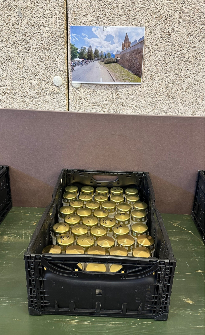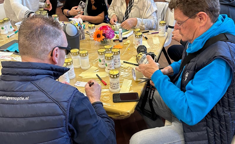 Het was heel emotioneel en ook hier was de saamhorigheid groot. Iedereen die daar zat, had 1 of meerdere dierbaren die aan kanker was/waren overleden of nog volop aan het strijden zijn. Er werden de nodige tranen weggepinkt. Nadat de kaarsen waren geschreven, ging er transparant tape omheen, zodat het er niet af gaat als het gaat regenen. De kaarsen gingen in een krat met het nummer van de bocht waar je wil, dat ze geplaatst worden (in ons geval bocht 7 bij het kerkje). Tot slot kon je ook nog een vlaggetje schrijven, die ter plekke door een vrijwilliger aan de vlaggenlijn werd geregen. Deze lijn wordt bevestigd aan de finish donderdag.