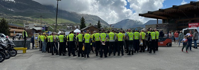 Terwijl we op de fietsen stonden te wachten, zagen we de hele groep motoren, die daar ook stond voor een werkbespreking. 100 motoren in totaal zijn aanwezig om alles in goede banen te leiden donderdag. Het was een fraai gezicht.