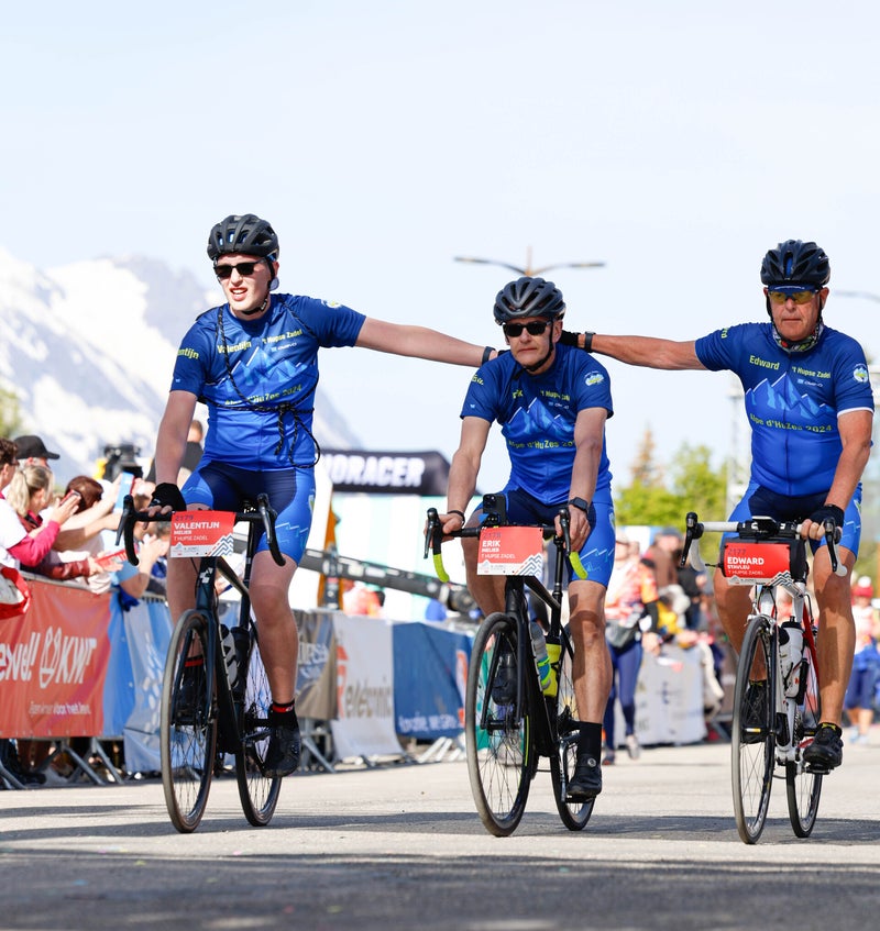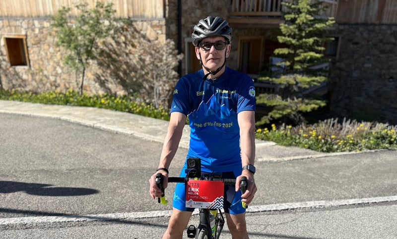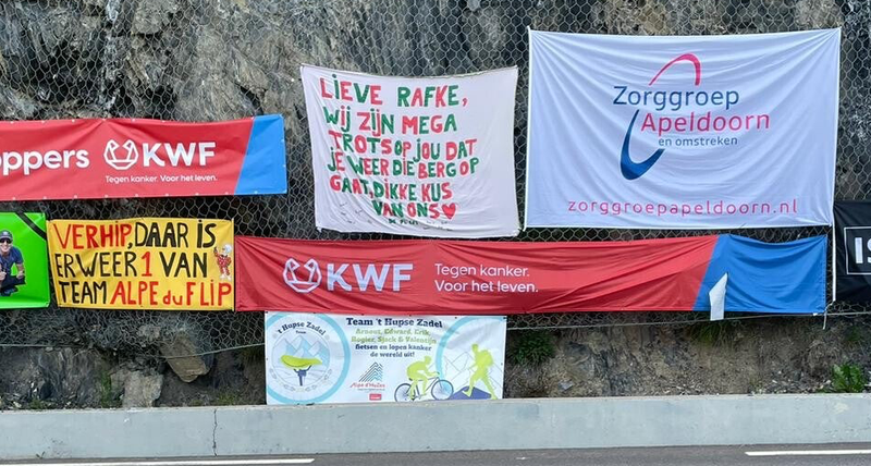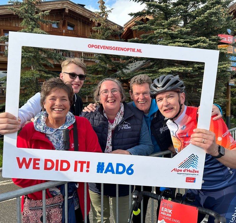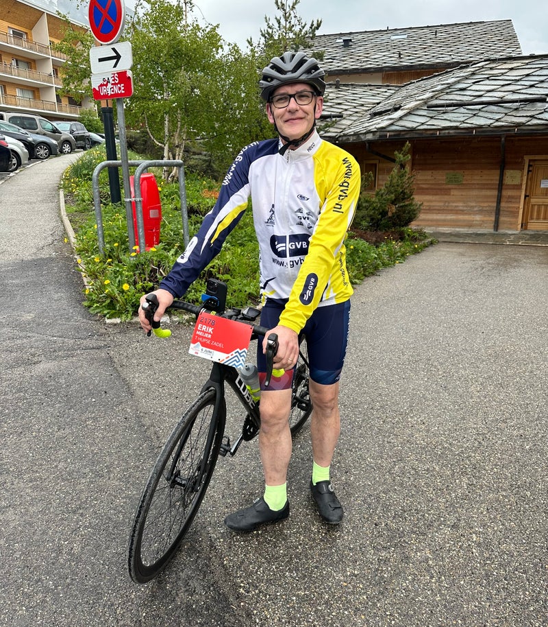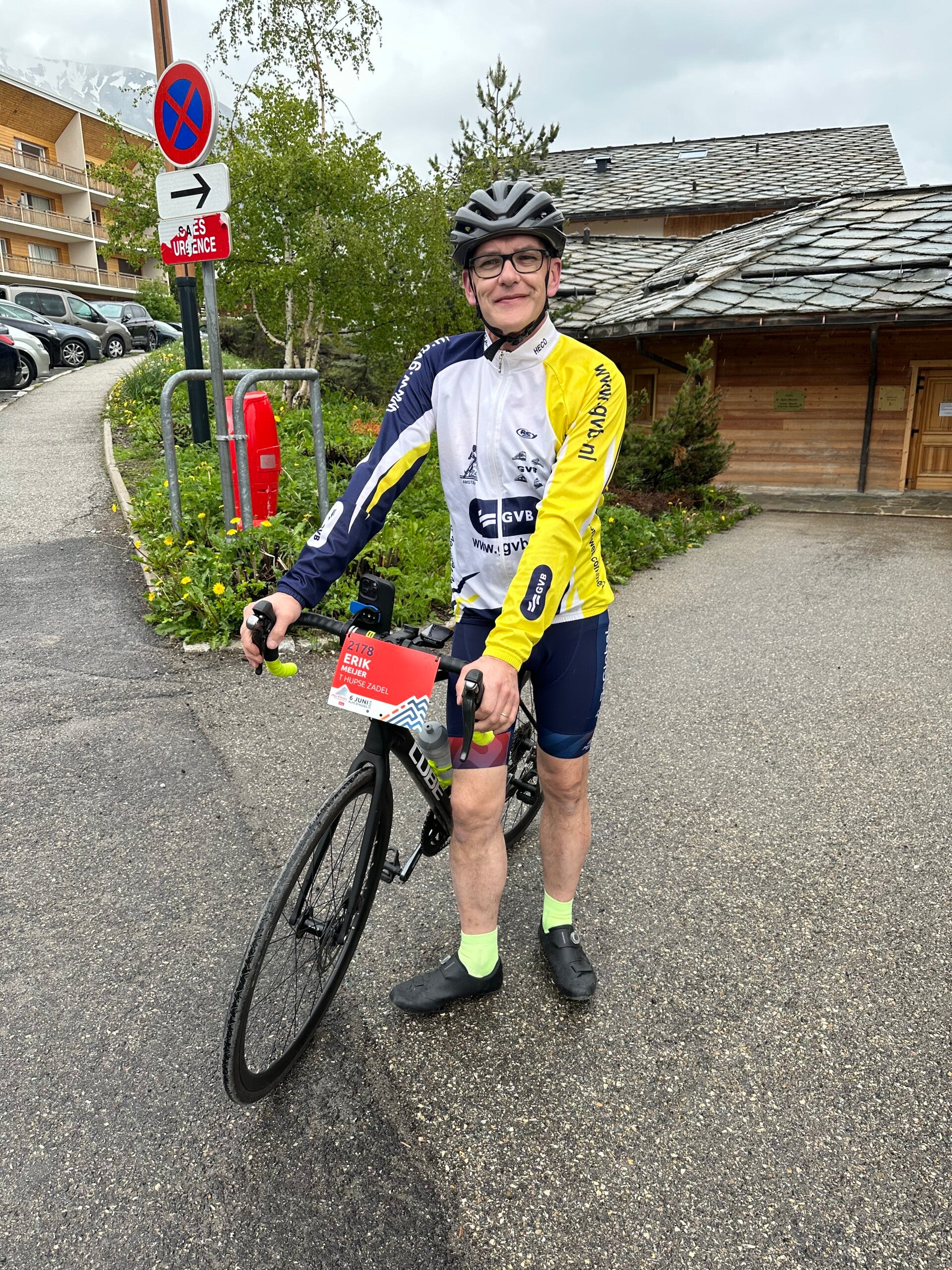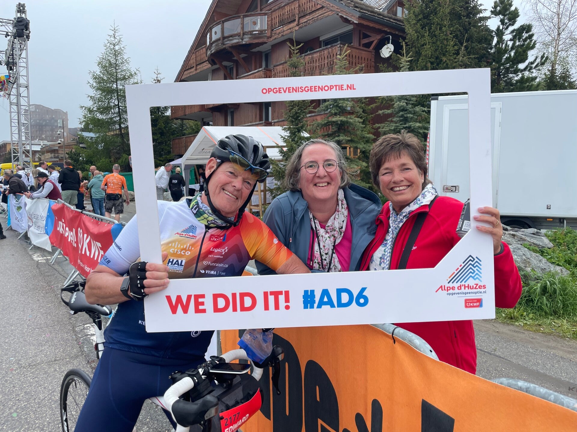 Niet veel later kwam Erik de bocht om en reed richting de finish. Een meter voor de finish stapte hij af en we dachten dat hij opgaf, maar nee... Hij wilde zijn fiets bedanken en tilde hem boven zijn hoofd en stapte over de lijn. Wat een emotie, hij had het geflikt. Drie keer de Alpe d’HuZes op, wat een prestatie!