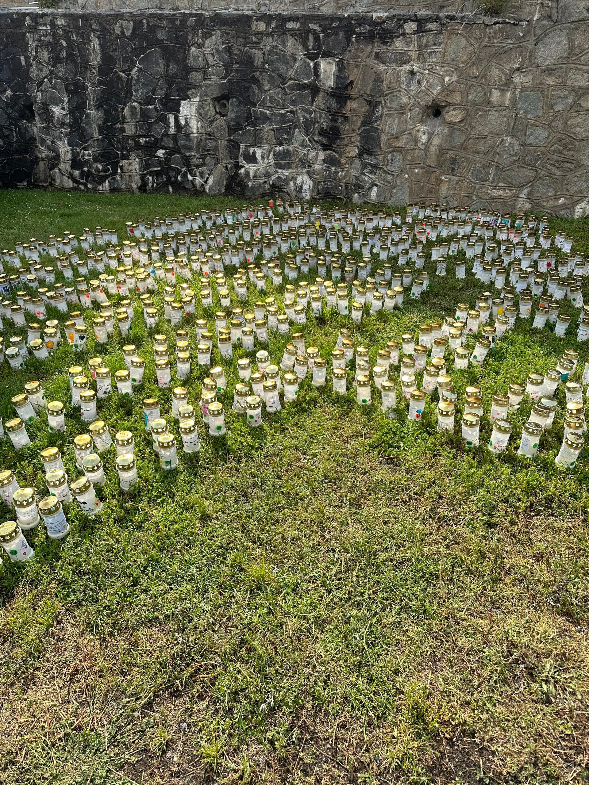 Erik had intussen besloten om nog een keer af te dalen. Het onweer was weg, alleen de regen bleef en het zag er niet naar uit, dat dit op korte termijn zou stoppen. Warm aangekleed en fris gedoucht, begon hij aan zijn 3e afdaling en precies om 16.00 uur mocht hij weer omhoog de berg op. Hij stopte af en toe even om een paar foto’s te maken en bij bocht 7 (bij het kerkje) ging hij op zoek naar onze kaarsen. Het was even goed speuren, maar uiteindelijk had hij ze gevonden.