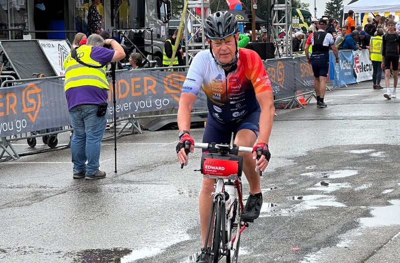 Edward was inmiddels ook weer naar beneden om zich voor te bereiden op zijn 3e beklimming, maar ontdekte eenmaal beneden, dat zijn velg was gescheurd. Gelukkig boden de heren van Bike Totaal wederom hulp, maar hadden helaas geen nieuwe velg meer. Er stond nog wel een ander wiel van iemand met een lekke band. Daar hebben ze de velg van gebruikt en Edward’s eigen wiel bleef achter. Gelukkig kon hij daarna alsnog beginnen met zijn 3e klim en kwam om 12.26 uur boven na 1 uur en 47 minuten.