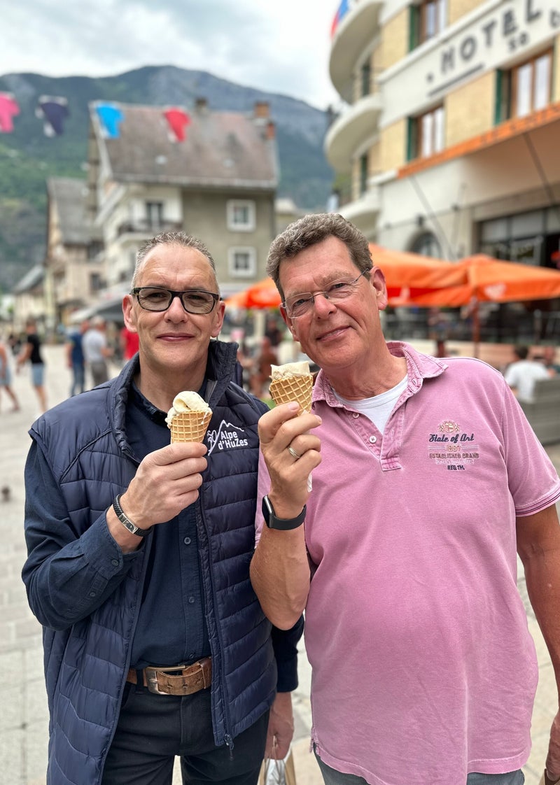 Aangekomen in Le Bourg-d'Oisans parkeren we de auto en lopen richting winkelstraat. Edward en Carla scoren daar een paar nieuwe wandelschoenen en ook Erik scoort een mooi fietsshirt in de neon-gele kleur van zijn fiets. Alle bochten van de Alpe d’Huez staan erop en alle winnaars van de Alpe d’Huez etappes tijdens de Tour de France. Valentijn koopt een nieuwe baseball pet en daarna duiken Carla, Valentijn en ik een toeristenwinkel binnen. Eenmaal weer buiten betrappen we Erik en Edward likkend aan een ijsje en besluiten Carla en ik er ook maar één te halen.
